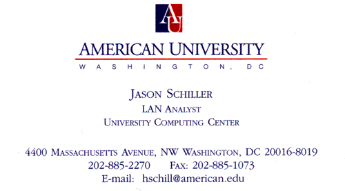 | My first full time position was at The American University. Here I worked as a LAN analyst. It was at AU where I first really came to understand TCP/IP, subnetting, LAN design, and LAN troubleshooting. I had a very hands on job that allowed for installing new multi-mode fiber links, designing and deployiong new building networks, router and concentrator configuration, and Novell NetWare administration. In fact AU was Novell's test ground for NetWare 4.0 and the NDS. I had a very intamate relationship with the AU network, and sometimes miss the hands on aspect of operating that network. |