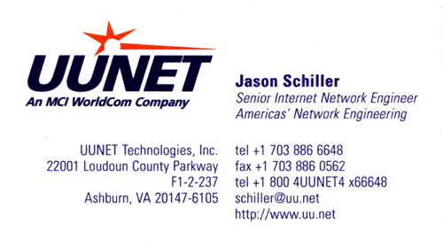 | From 1998 to 2011, I worked at UUNET (WorldCom / MCI / Verizon Business) as a network engineer. At UUNET I have had a chance to not only learn routing protocols such as IS-IS and BGP, but to understand how they function and scale in one of the largest and most rigorously Engineered IP networks in the industry. They have a large test lab where I have had a chance to test everything from new hardware, to new features, as well as completing proof of concept tests for new possible network designs. UUNET was an exciting environment where I not only played with cutting edge technology, but also worked with vendors to define and deliver what features are important to our network. |