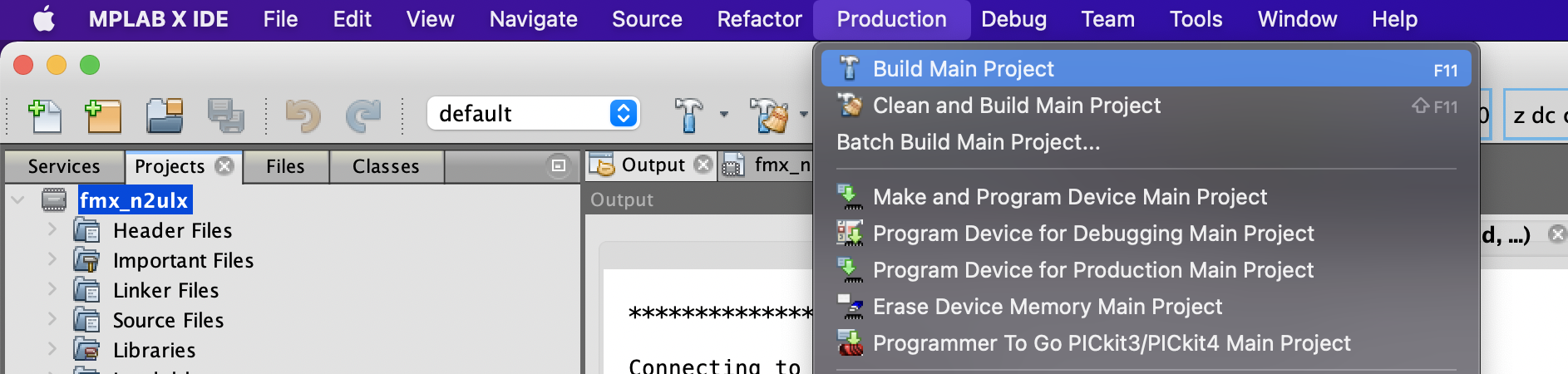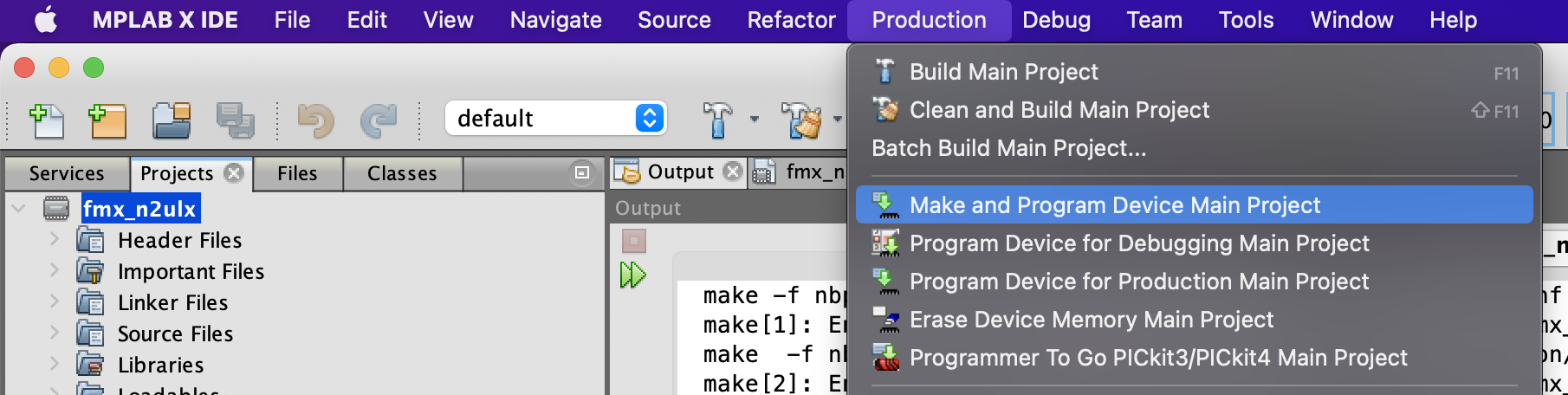 Lastly, program the chip. Click on: Production > Make and Program Device Main Project OR click the icon of the green arrow download code to the chip. |