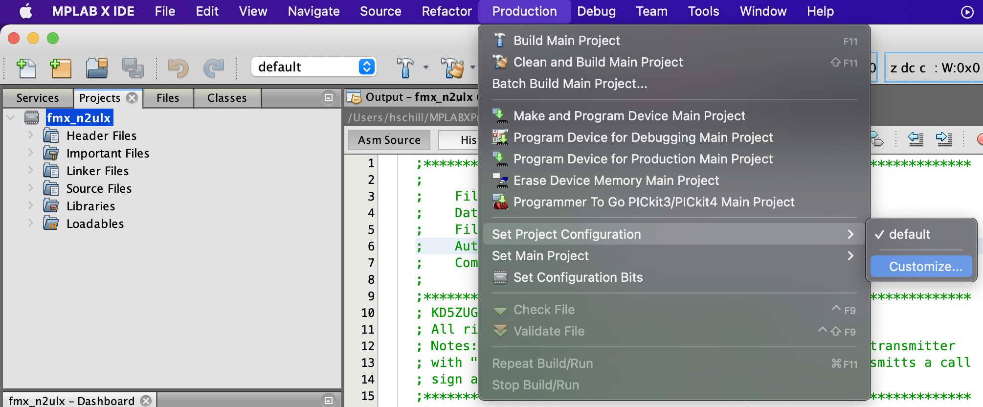 Open MPLAB X IDE. Open your project. Click on: Production > Set Project Configuration > Customize |