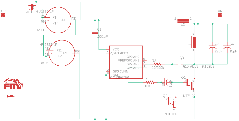 Install the two battery holders, one on each side of the circuit board. Next, use 12 inches of 20 - 24 gauge common "hook-up" wire as the antenna and counterpoise. These attach to the larger holes at either side of the circuit board labeled “ANT” and "CP". Install the two pin jumper near the battery holder. Lastly install the PIC microcontroller Chip into the 8 pin DIP socket, ensuring that the top with the notch is facing the battery as indicated by the DIP socket. You may have to to bend the pins of the chip slightly to make them perpendicular such that they fit in the DIP socket. If you need to compile and/or program the PIC, do so prior to installing into the DIP socket. This can be done with MPLAB IDE and a PICkit3. Detailed instructions follow. Source code and hex files can be found at: www.schiller.net/jason/fmx/|