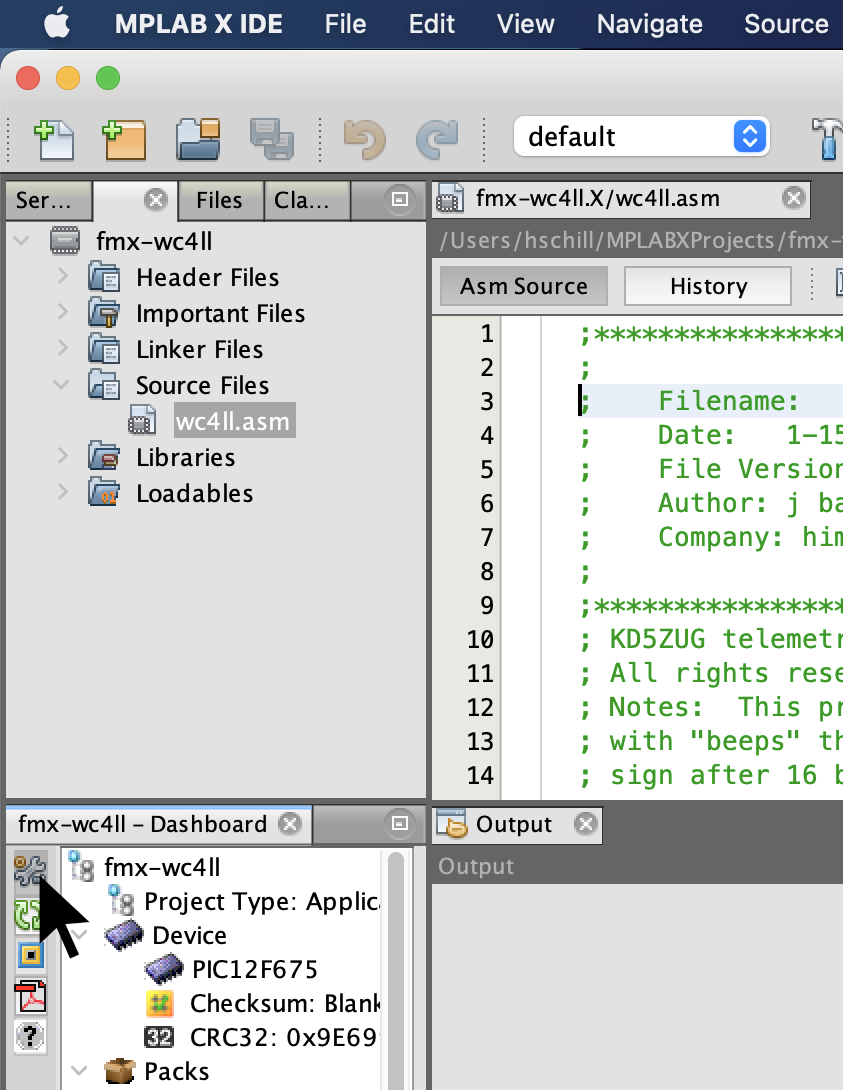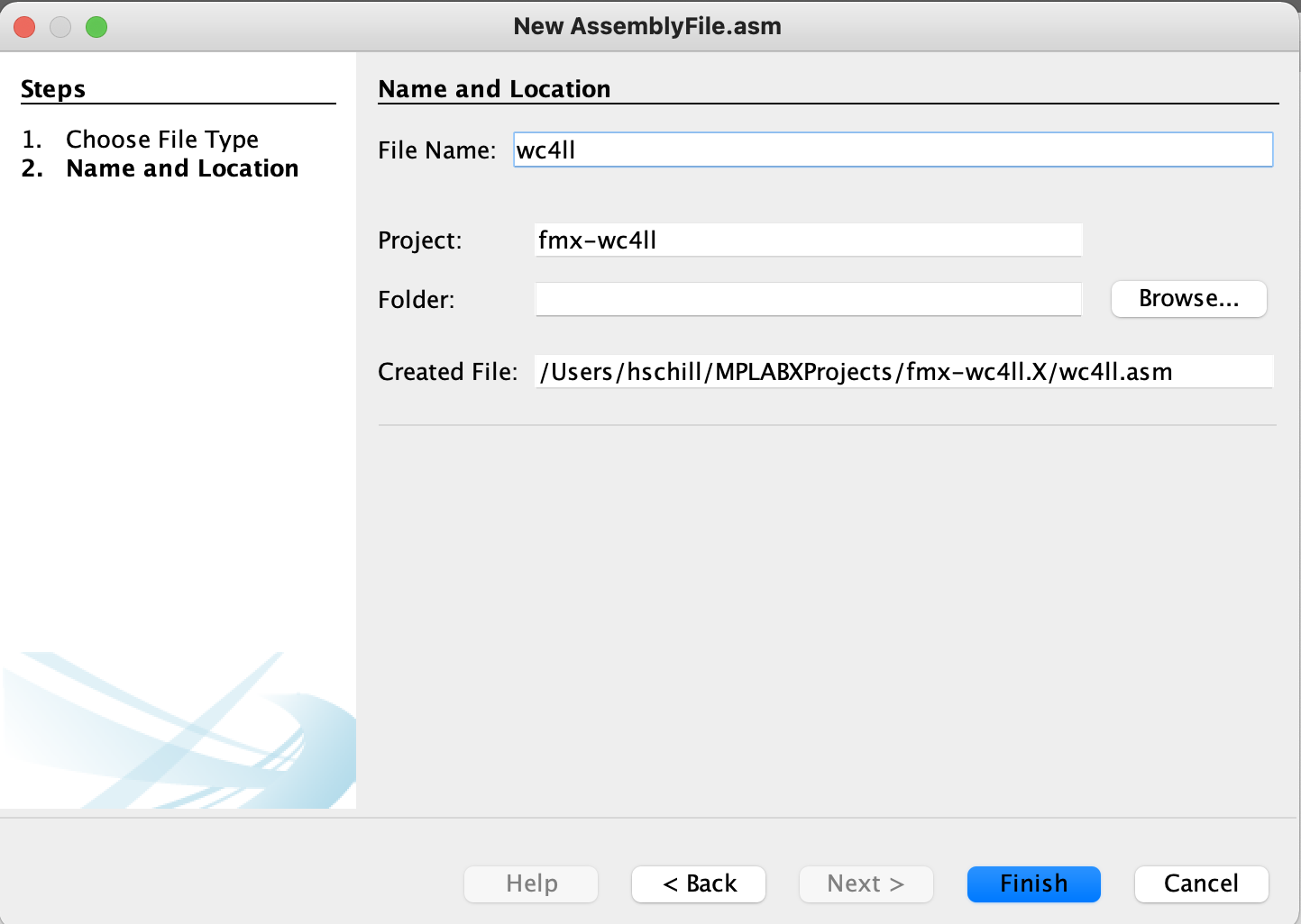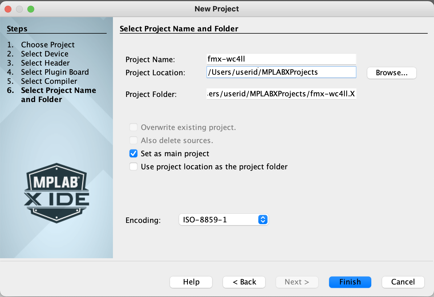 Select the project name. Use fmx-<your_call_sign>. In this example we use the call sign WC4LL, and the project name fmx-wc4ll. Click the Finish button. By default the project is created under your home directory and under a directory called MPLABXProjects. |
