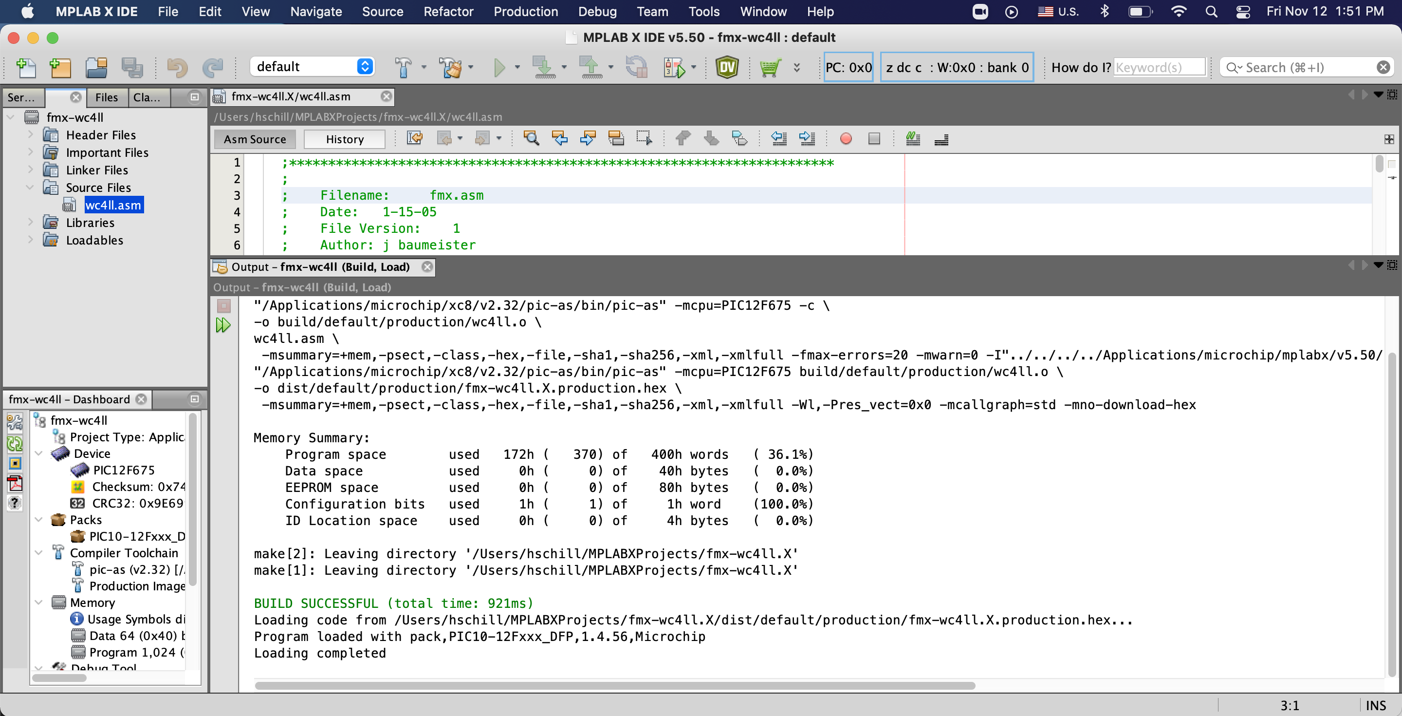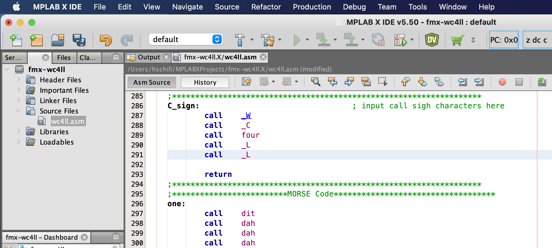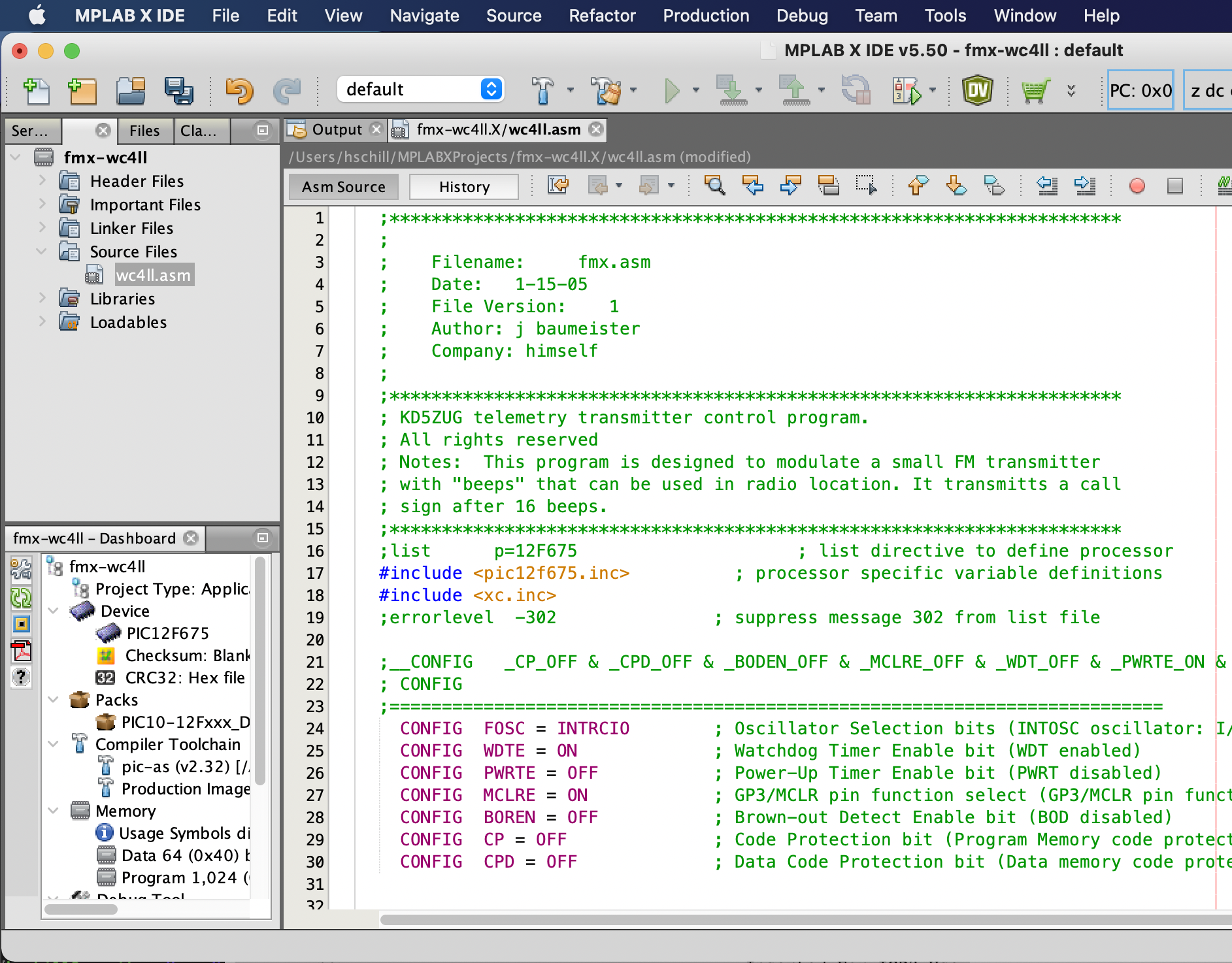 Select the project name. Use fmx-<your_call_sign>. In this example we use the call sign WC4LL, and the project name fmx-wc4ll. Click the Finish button. By default the project is created under your home directory and under a directory called MPLABXProjects. |