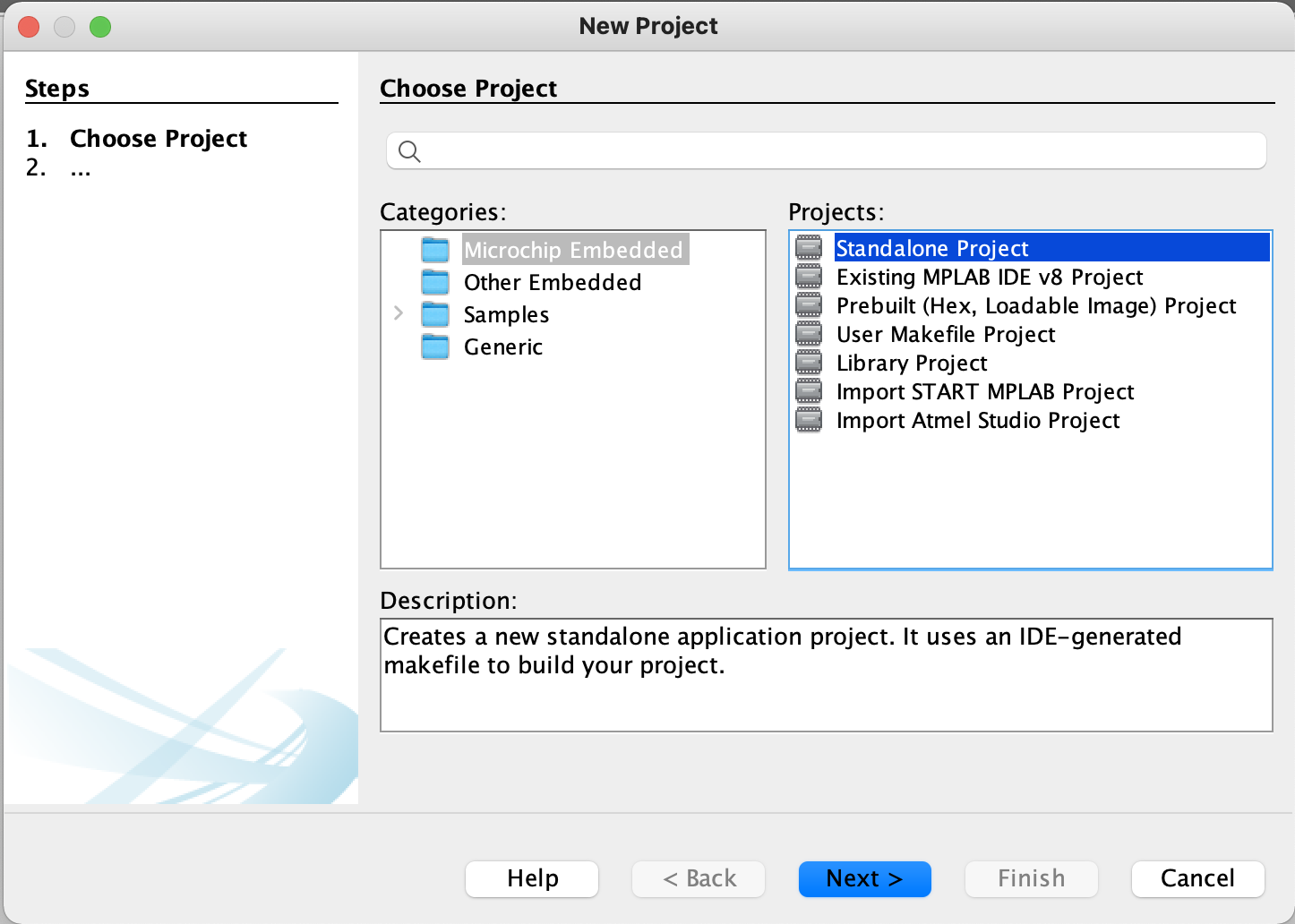 Choose new project catagory: Microchip Embeded and project: Standalone Project Then click the Next button. |