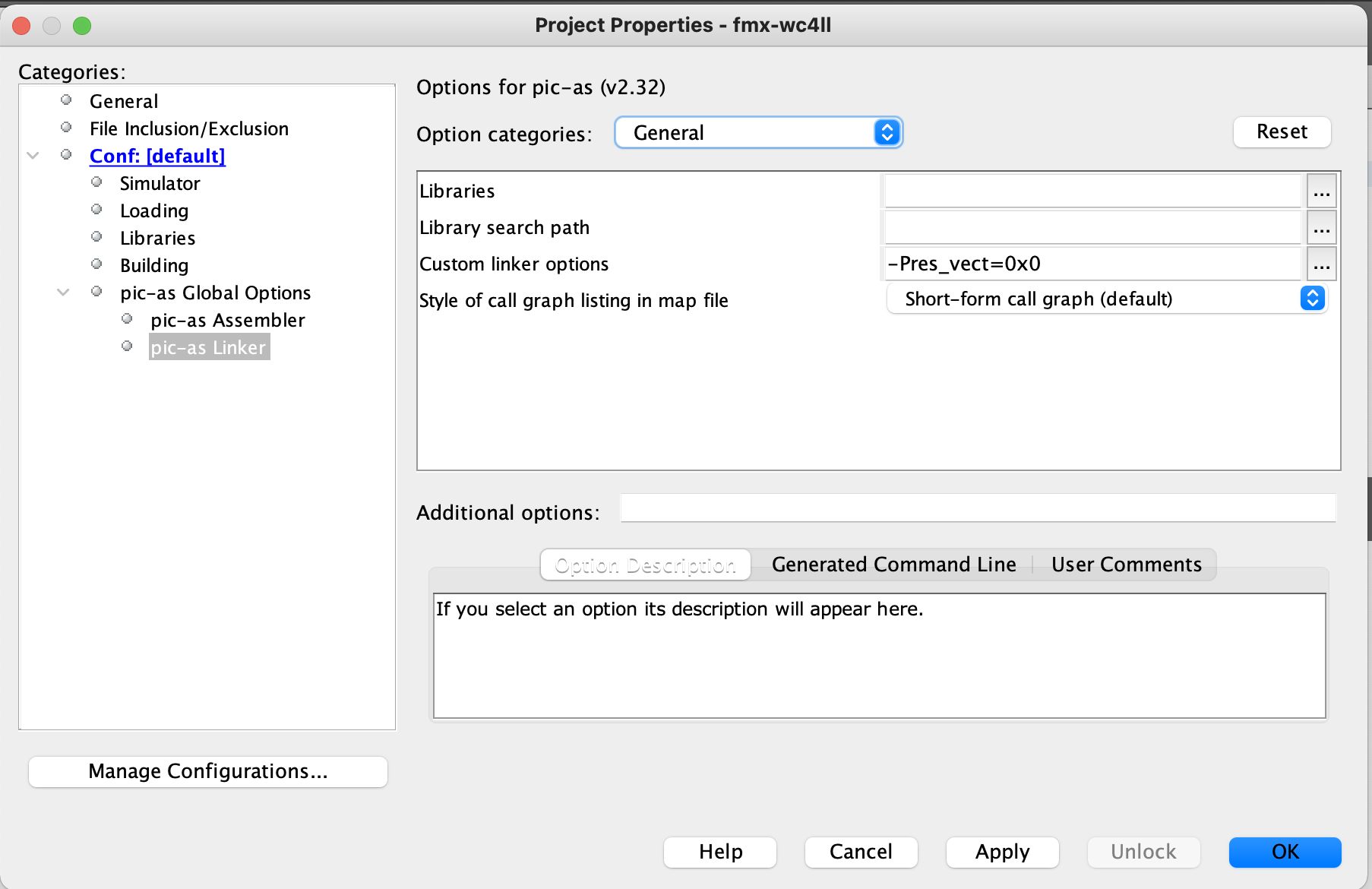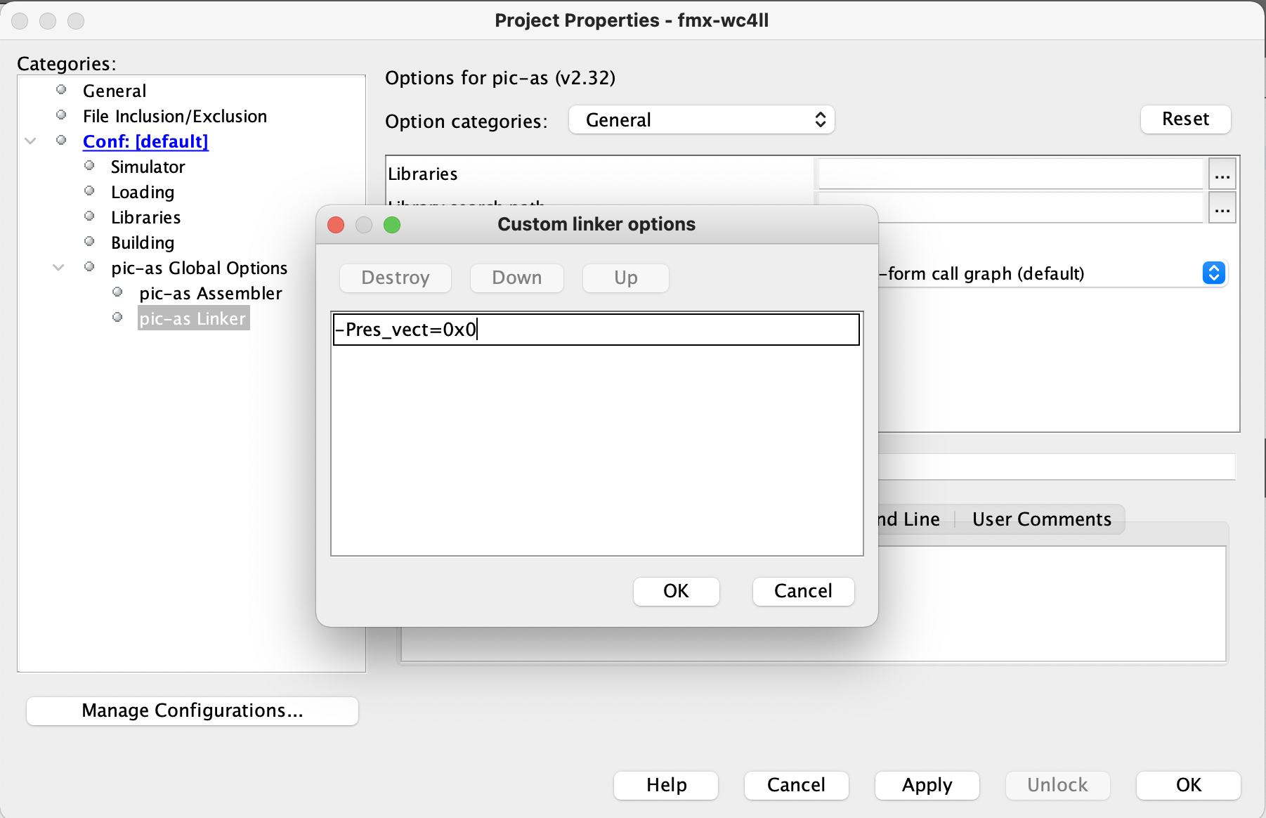 set the customer Linker options to: -Pres_vect-0x0 and click the OK button. |