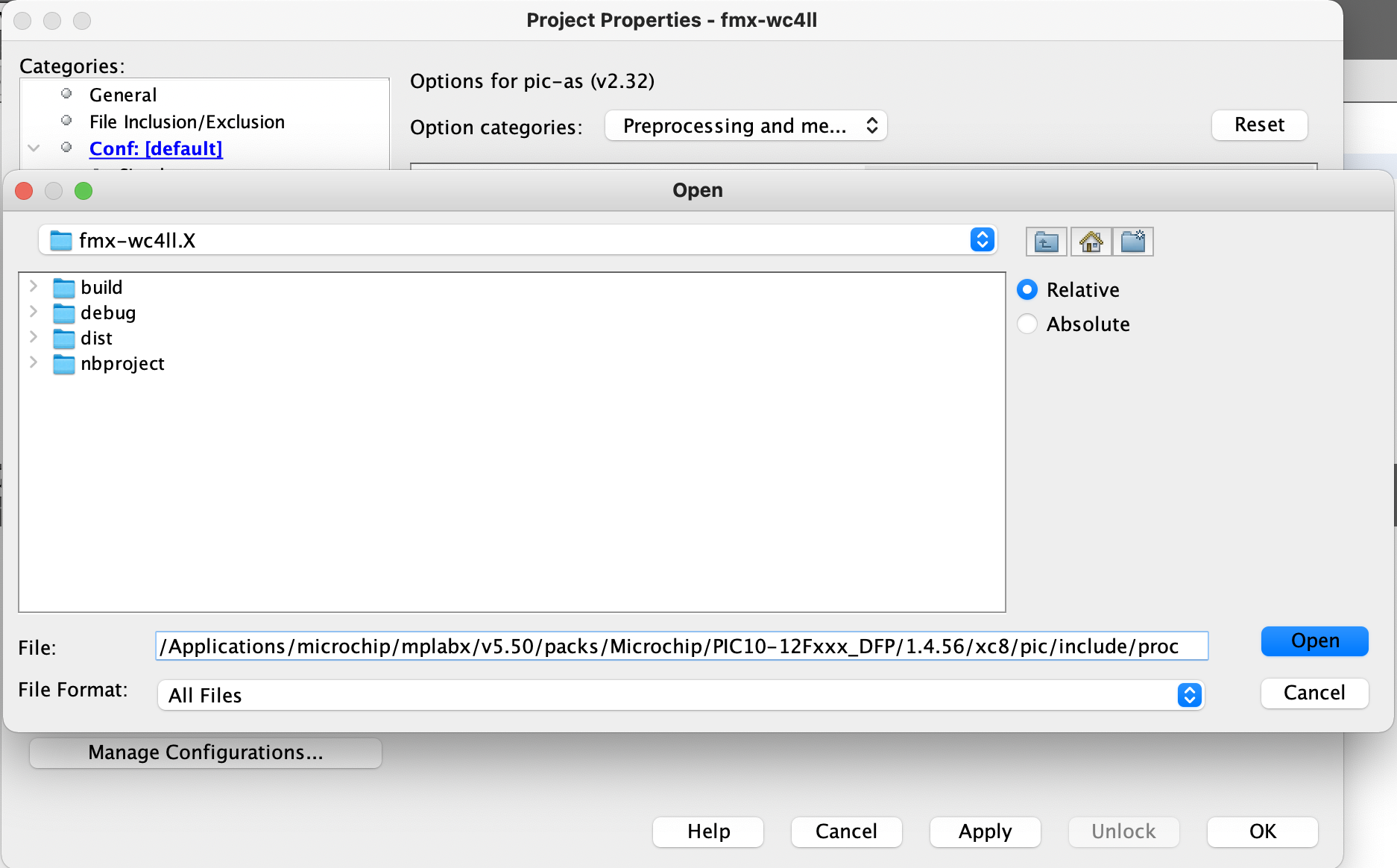 Set the include directory as: /Applications/microchip/mplabx/v5.50/packs/Microchip/PIC10-12Fxxx_DFP/1.4.56/xc8/pic/include/proc and click the Open button |