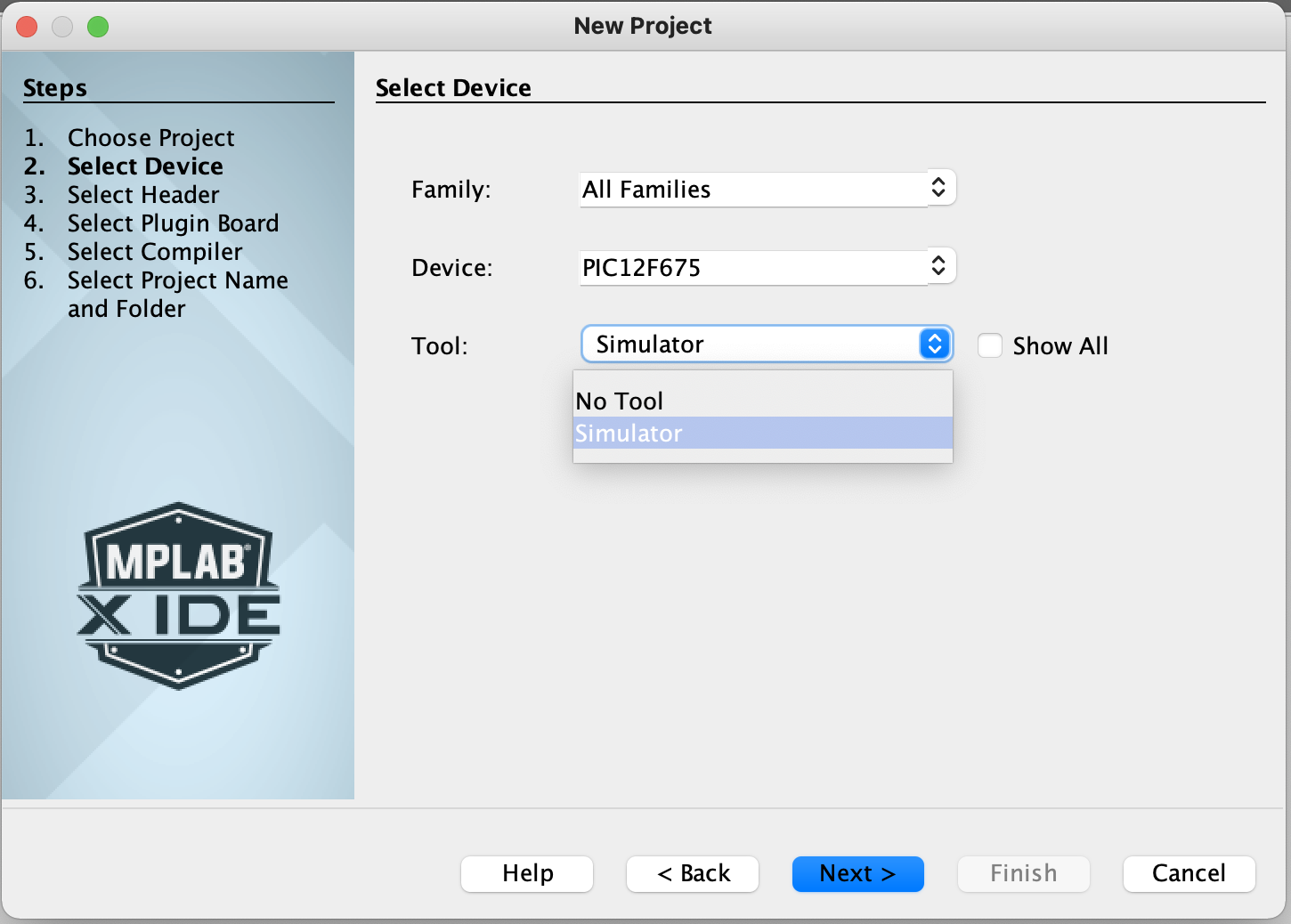 For device type the name of the chip "pic12f675". Then select simulator, and click the Next button. |
