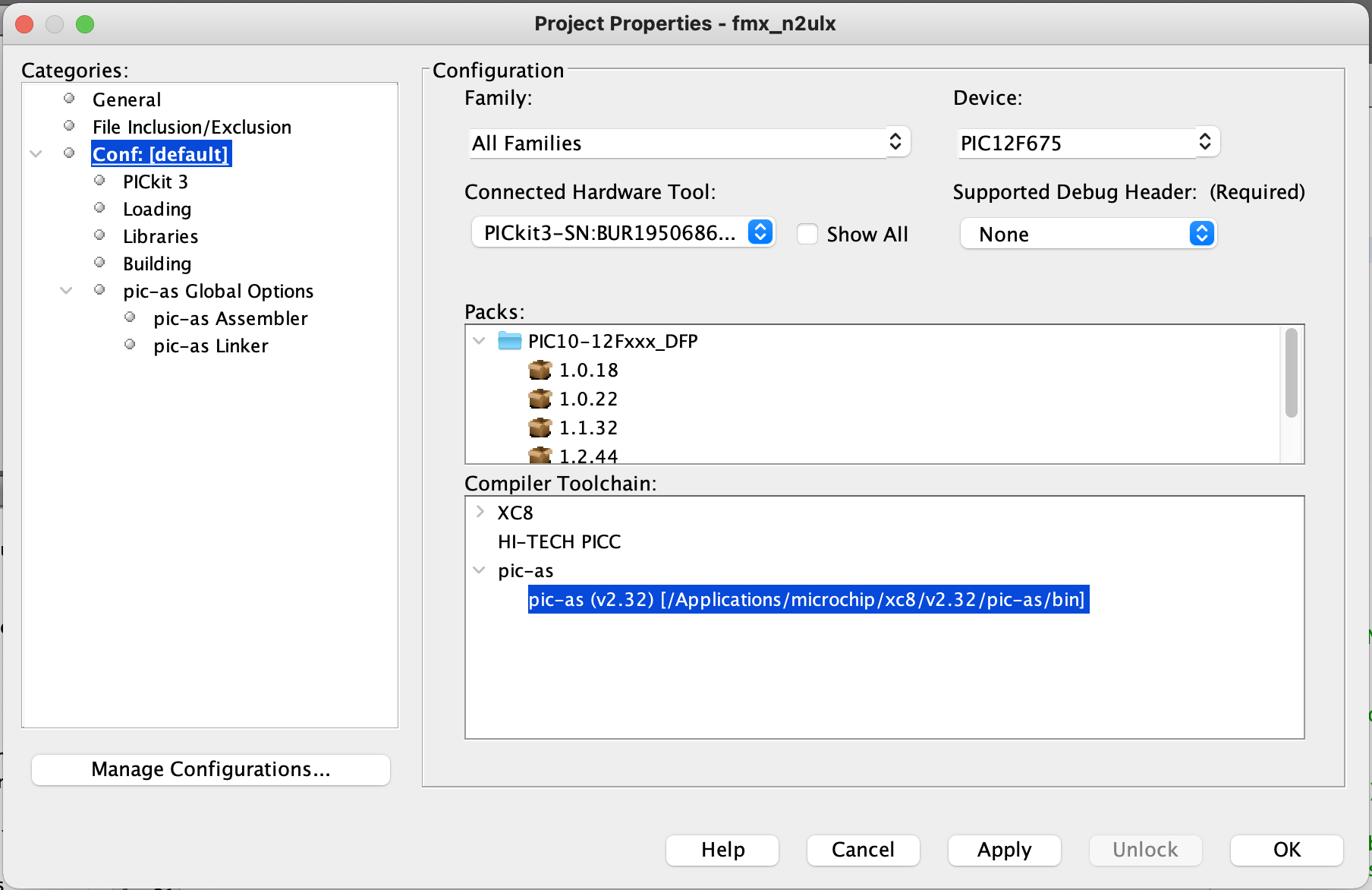 Click on the Category Conf [default] And make sure PICKit3 is selected for the connected Hardware Tool |