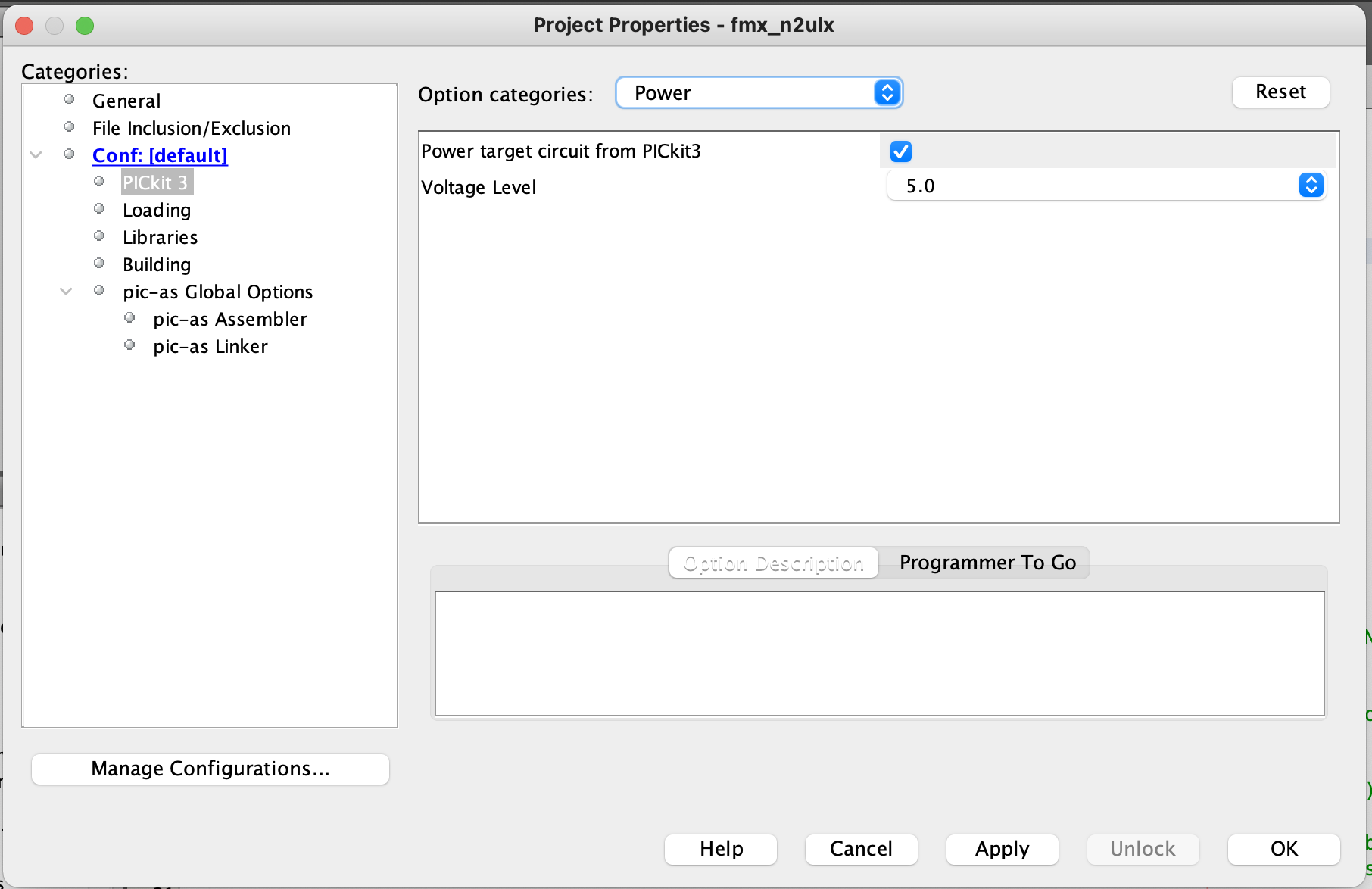 Click on the Category PICkit 3 Select Option Category: Power |