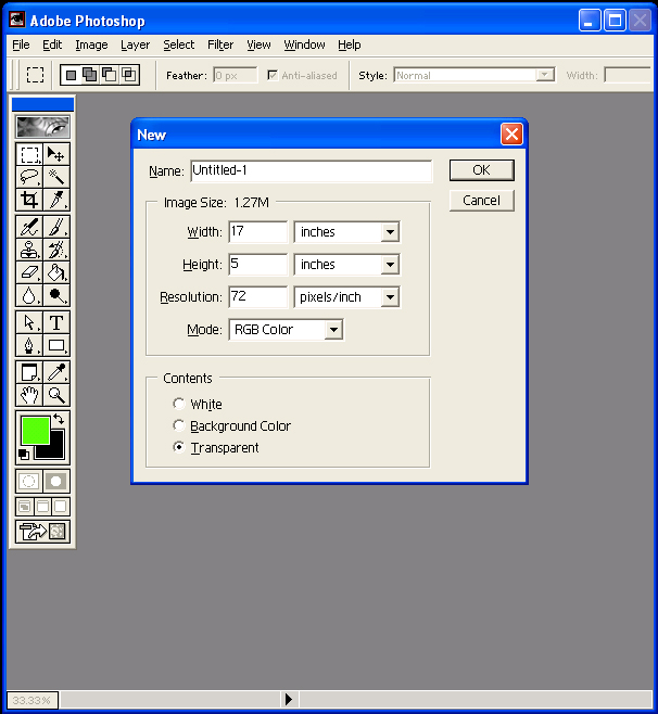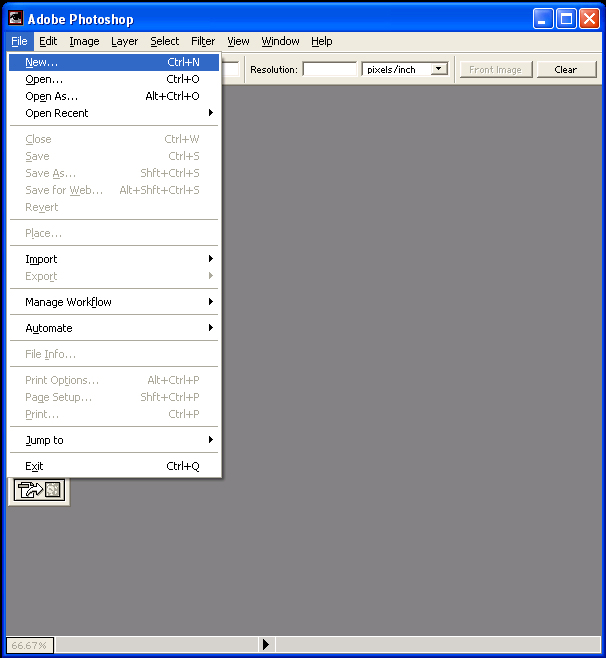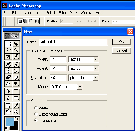 Next open Photoshop (examples are from version 6.0). Create a new image by clicking on File, New.